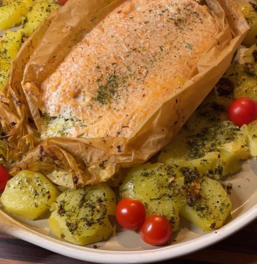Zarter Lachs im Lauchbett mit gebackenen Kräuterkartoffeln