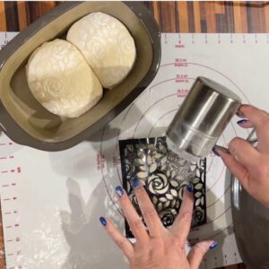 - Jede Kugel mit einer Schablone und Mehl dekorieren und in die in einer gefetteter kleiner Zaubermeister oder Kastenform legen.